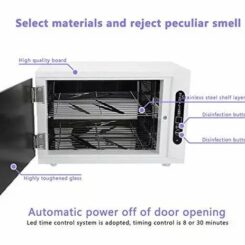 Dieser UV-Sterilisatorschrank kann zum Sterilisieren von Bürsten, Kämmen, Handtüchern, Maniküre- und Pediküregeräten, chirurgischen Geräten, Scheren, Nagelhautschiebern und ähnlichem verwendet werden. Eingebaute UV-Lampe (ultraviolettes Licht) zum Sterilisieren verschiedener Arten von Werkzeugen. Reinigen Sie Ihre Utensilien effektiv und einfach. Drei Timer-Einstellmodi (30-60-90 min) zur Auswahl, automatische Abschaltung.