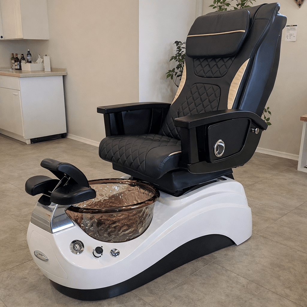 Unsere hochwertigen Spa-Pedikürestühle bringen modernes Design und maximalen Komfort in unser Studio. Mit eleganter schwarzer Polsterung, stilvollen Details und ergonomischer Form sorgen sie für ein luxuriöses Wohlfühlerlebnis bei jeder Behandlung.